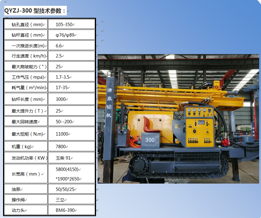 清泉300型潛孔水井鉆機(jī) 發(fā)動(dòng)機(jī)功率:玉柴92千瓦。 油泵:美國泊姆克三聯(lián)泵 動(dòng)力頭馬達(dá): BM6-390。 最大扭矩: 11000扭米。 最大提升力: 25噸v 操作閥:三立。 整機(jī)機(jī)重: 7. 8噸。 尺寸:長5.8米(底長4.15米),寬1.85米,高2.35米。 鉆孔直徑: 105-350 毫米。 鉆桿直徑:φ76/φ89毫米(3米)。 一次性推進(jìn)長度: 6600 毫米