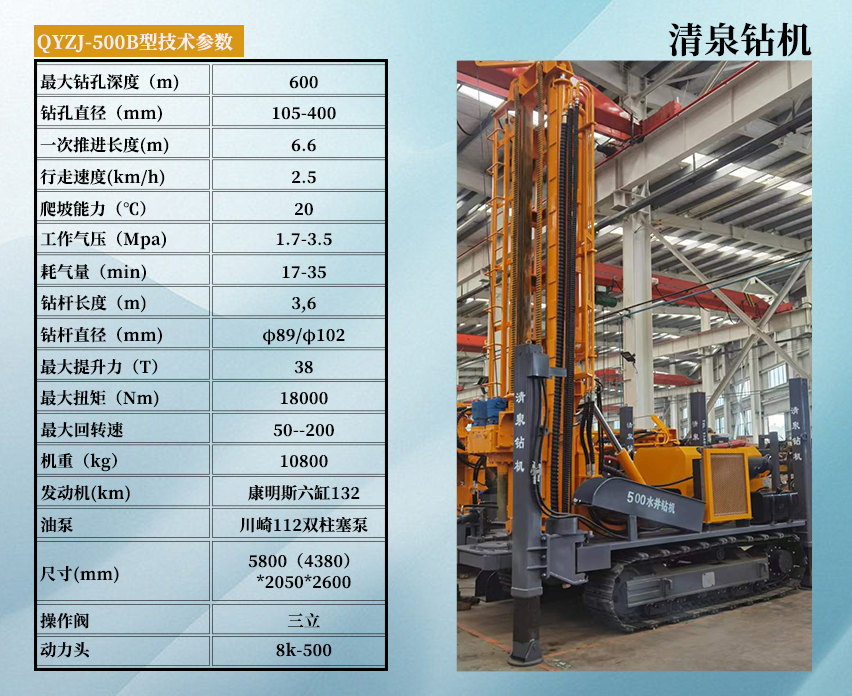 清泉500型潛孔水井鉆機(jī) 發(fā)動(dòng)機(jī)功率:康明斯六缸132kw 油泵:川崎112雙柱塞泵 動(dòng)力頭馬達(dá):8K--500.最大扭矩:18000扭米最大提升力:38噸操作閥:三立整機(jī)機(jī)重:10.8噸 尺寸:長(zhǎng)5.8米(底長(zhǎng)4.38米),寬2.05米,高2.6米鉆孔直徑:105-400毫米, 鉆桿直徑:89/$102(3米)。一次性推進(jìn)長(zhǎng)度:6600毫米!